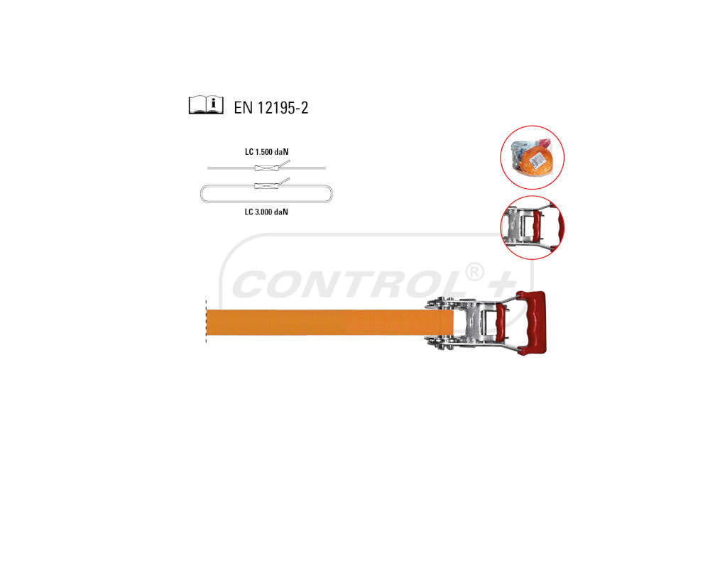 Amarre de cargas 3000KG-7M, cierre carraca con cinta sin fin, asa ergonómica plastificada en color rojo, ancho 35 mm, color naranja, largo 7 metros. Fabricado en poliéster de alta tenacidad, para una tensión máxima de 3000 KG (coeficiente de seguridad 2:1)