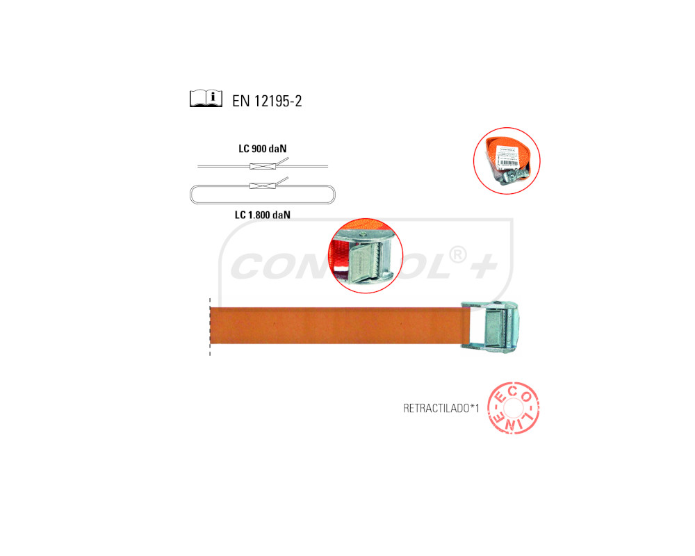 Amarre de cargas 1800KG-5M, cierre hebilla presión, con cinta sin fin, ancho de la cinta 35 mm, color naranja, largo 5 metros. Fabricado en poliéster de alta tenacidad, para una tensión máxima de 1800 KG (coeficiente de seguridad 2:1)