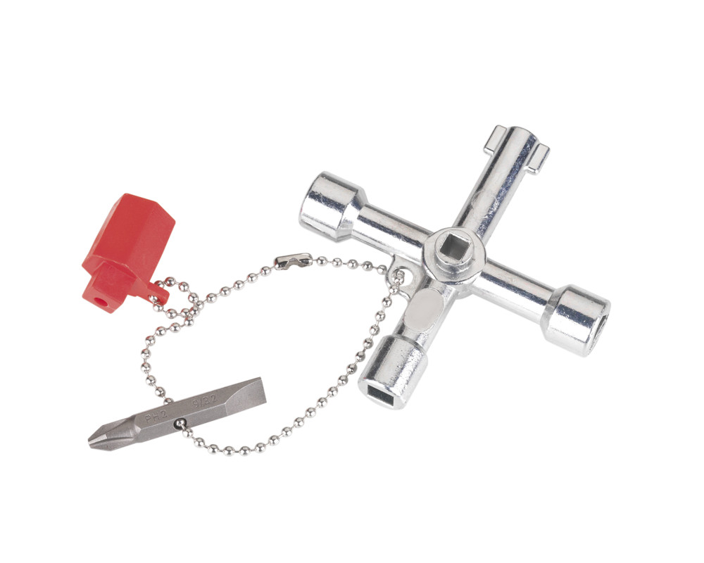 Llave multifuncional para sistemas de paso en construcción, cuadros eléctricos, calefacción, fontanería, climatización, ventilación, electrotécnica, suministro de gas y agua y sistemas de bloqueo.