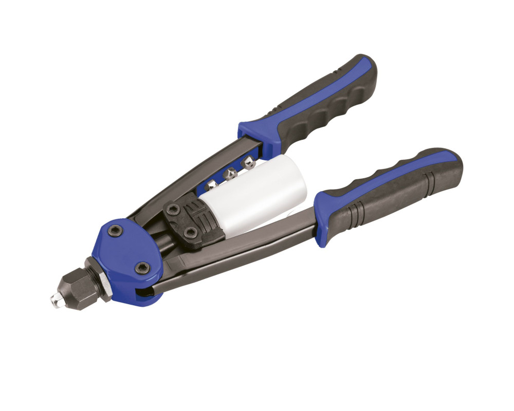 Cuenta con un cuerpo fabricado en aluminio y con mangos bimaterial de agarre ergonómico, que permiten un uso más cómodo de la herramienta. Su diseño reduce en un 30% el esfuerzo de la mano. Incorpora una botella de plástico recogedora de remaches, que agiliza los trabajos.