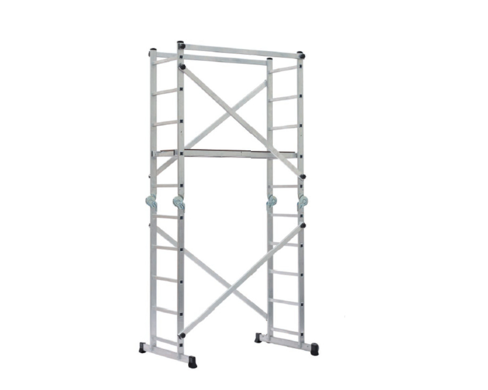 Andamio multifuncional de aluminio para bricolaje (DIY). Máxima versatilidad al permitir 3 funciones: Andamio, escalera extensible y escalera de tijera para trabajos hasta 4 m. Cómodo al ser montando o desmontado en poco más de cinco minutos, sin necesidad de herramientas y moverse fácilmente de un lugar a otro, gracias a la incorporación de ruedas. Plataforma 1200x440mm.