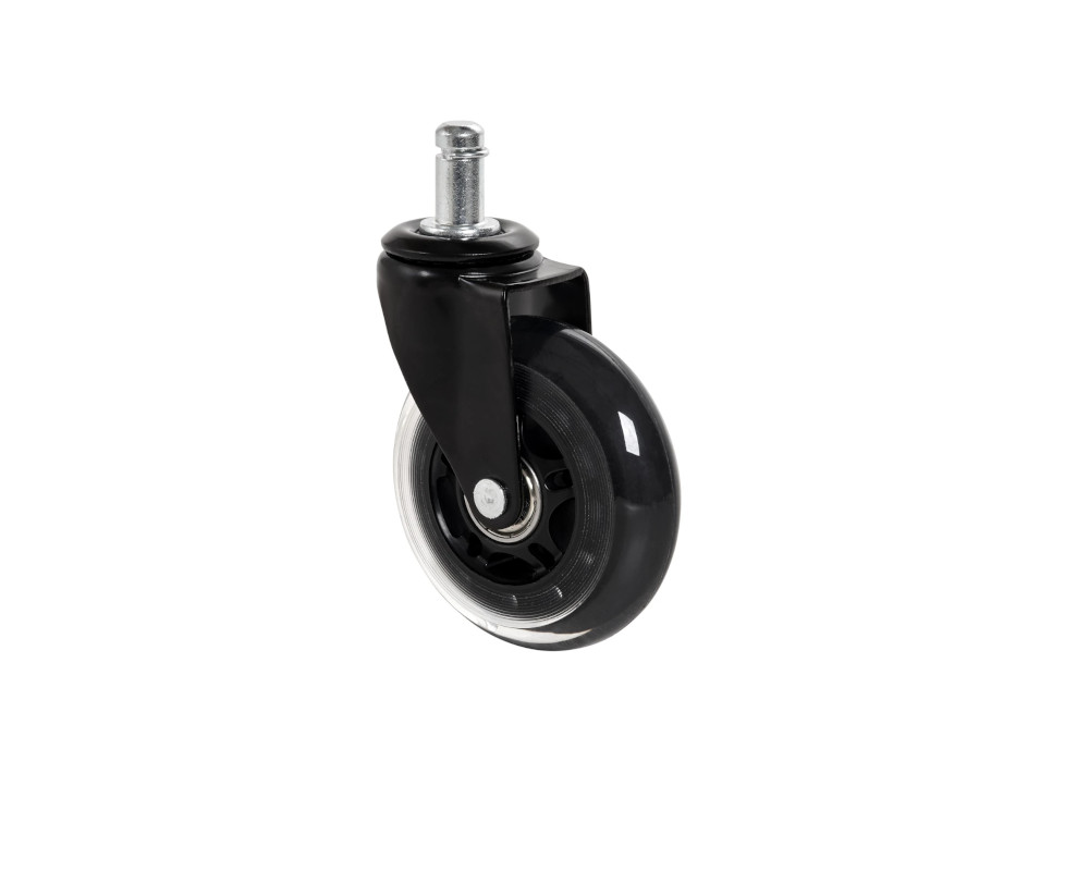 Ruedas universales de poliuretano transparente, diseñadas para una instalación rápida y sencilla. Cuentan con soporte de acero negro y están recomendadas para cargas de hasta 40 kg por rueda.