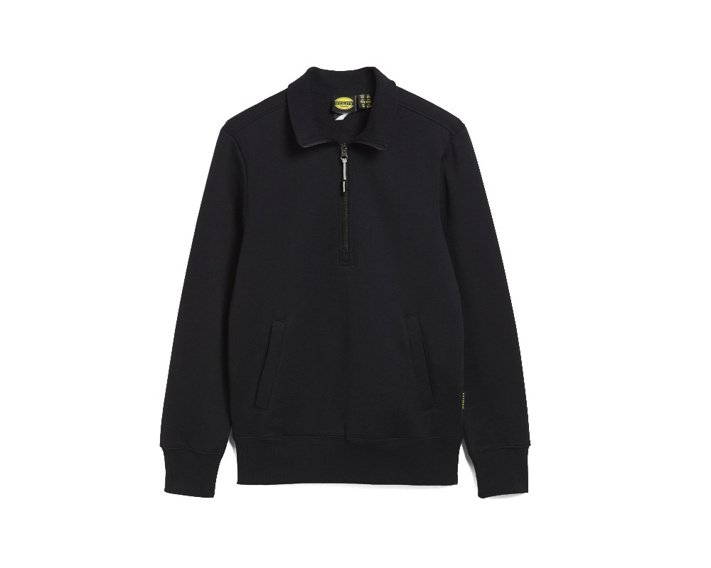Sudadera de poliéster y algodón, perchada, con media cremallera. Dos bolsillos abiertos laterales. Cuello, puños y bajo en canalé elástico. Tejido testado para lavados industriales según ISO 15797.