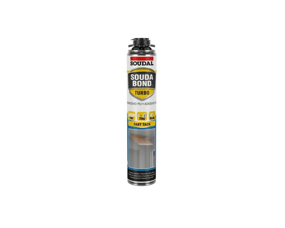 Soudabond Turbo es un adhesivo de poliuretano de secado rápido y agarre inmediato, gracias a su tecnología de baja expansión, para uso en interiores. Es ideal para materiales pequeños o ligeros de todo tipo. Solo hace falta esperar 1 minuto desde que se aplica sobre el material para que esté listo para pegarse. También es apto para pegados en techos, sólo hace falta sujetarlos durante 1 minuto más. En sólo 15 minutos se puede cortar, emplastecer y pintar.