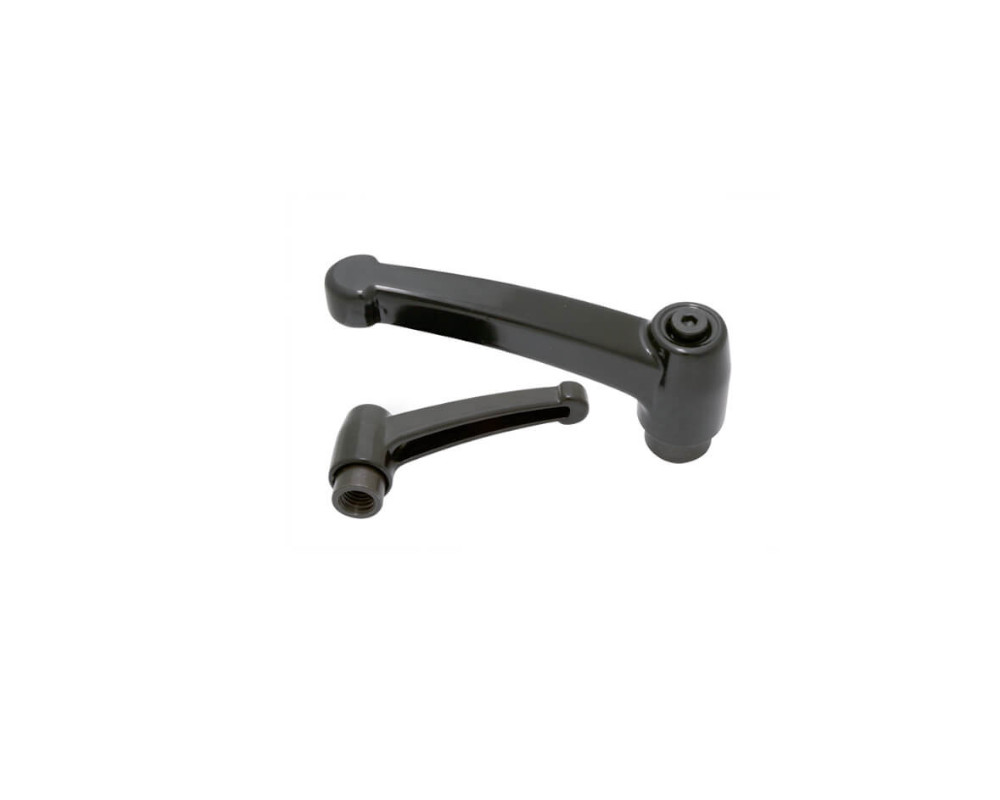 Componente de accionamiento manual diseñado para ofrecer un ajuste preciso y cómodo en aplicaciones industriales, especialmente donde se requiere realizar fijaciones frecuentes sin herramientas. Está compuesta por una palanca ergonómica, generalmente fabricada en tecnopolímero resistente, y un inserto roscado hembra de acero o acero inoxidable, con un mecanismo interno de trinquete que permite reposicionar la palanca sin modificar la tensión aplicada.