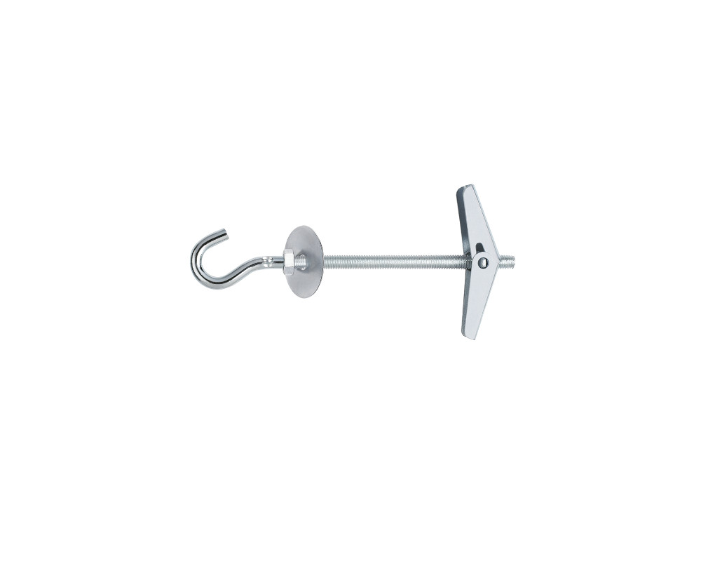 Palomilla con muelle, con gancho, tuerca y arandela. Está diseñada para instalar con facilidad elementos ligeros en techos de yeso laminado, hormigón hueco o escayola. Permite fijar objetos como ventiladores de techo, lámparas o plafones. Está fabricada en acero con recubrimiento zincado.